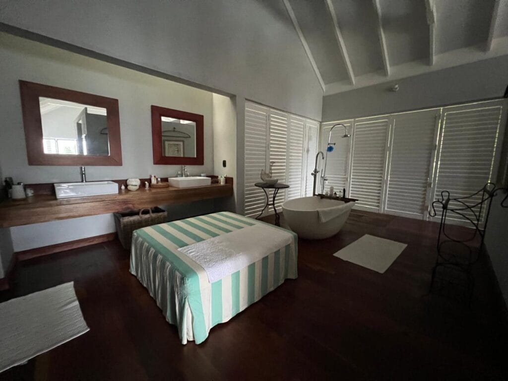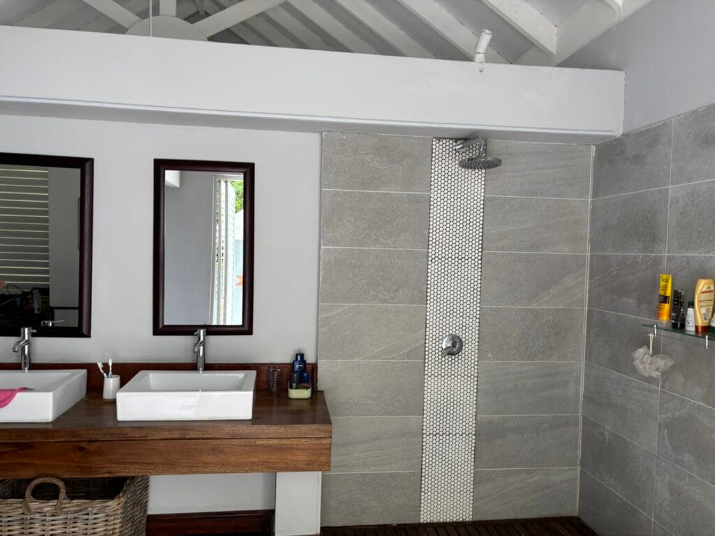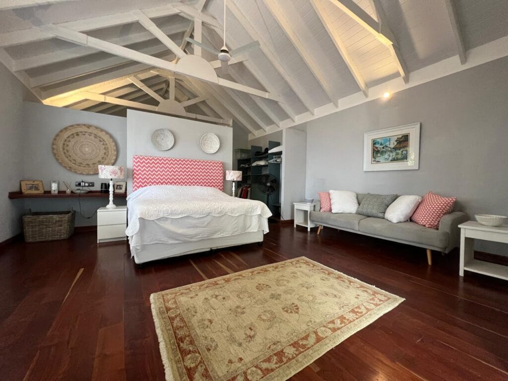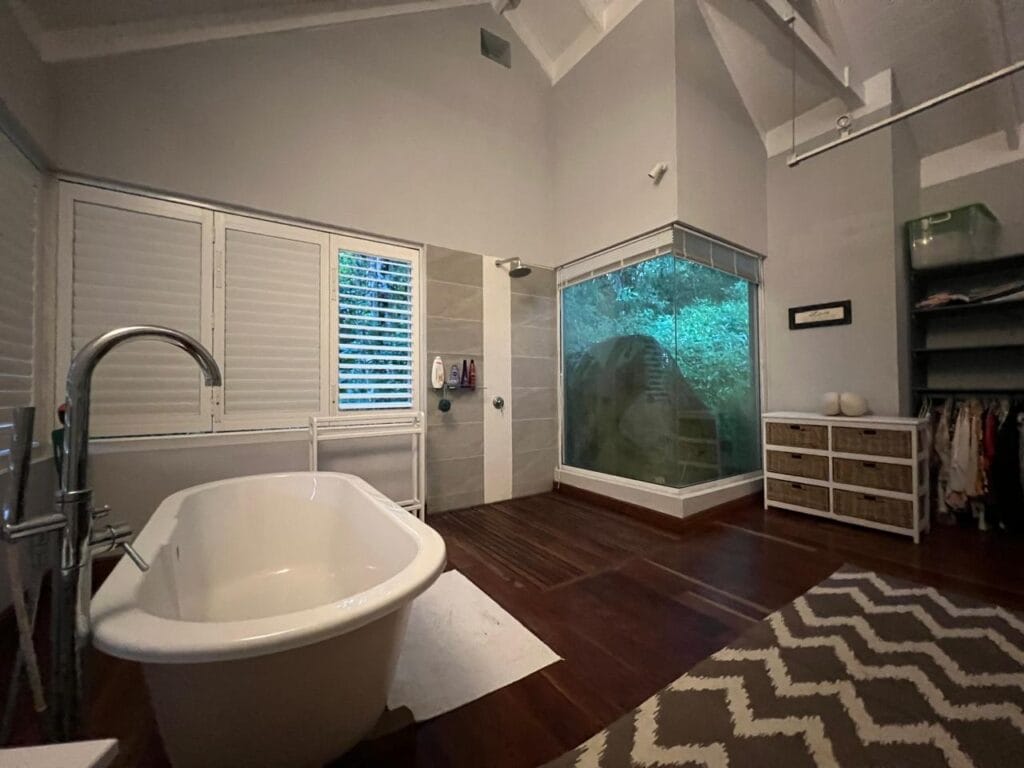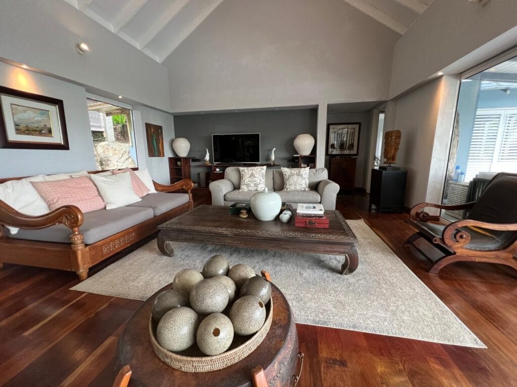 The residence is thoughtfully crafted with vaulted ceilings, adjustable shutters for natural ventilation, and premium Zambian Rosewood flooring. The outdoor areas feature Rhino wood decking, ensuring durability and a seamless connection with the island’s natural beauty.