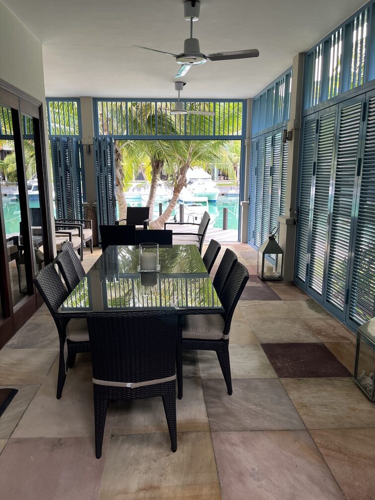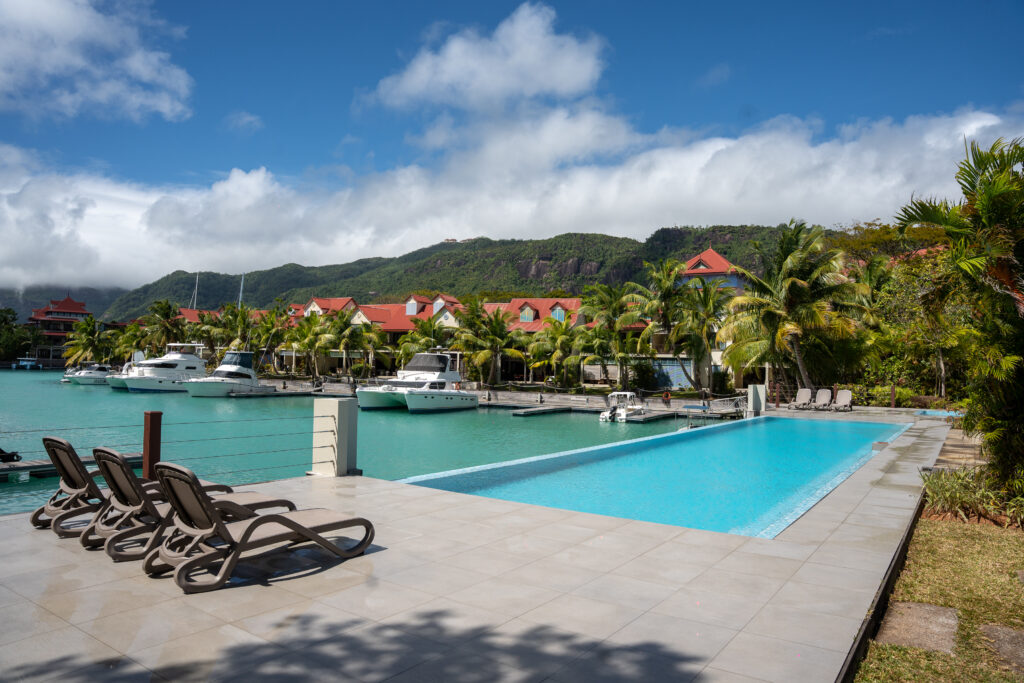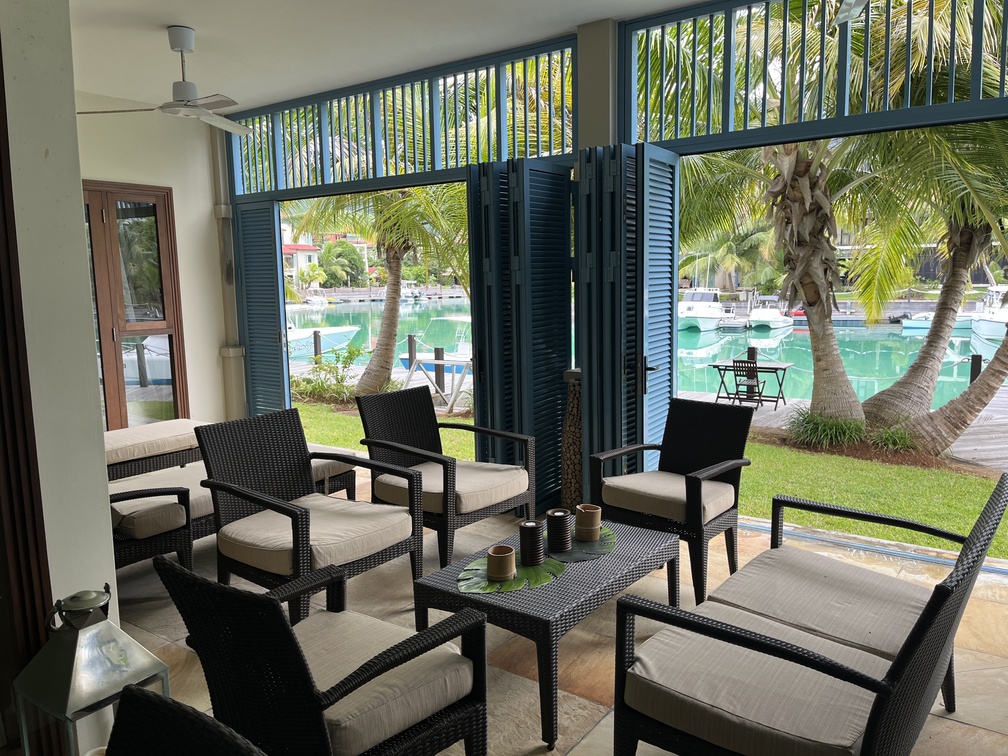 Inside, the open-plan kitchen and living area flow beautifully onto the terrace, capturing stunning marina views with the lush Mahé mountains as the backdrop. In addition, the property includes a water rights area of up to 173 sqm, giving direct access and added versatility.